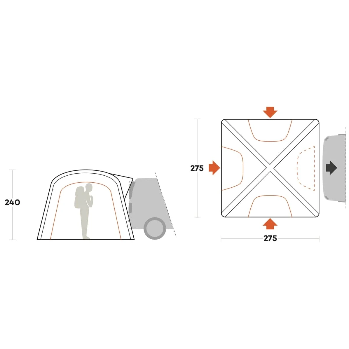 Samotný stan má tři vchody s moskytiérou a apsidou - dva boční a jeden přední, a upevňuje se přímo k pátým dveřím vozidla pomocí úchytů na kola a velkých pevných přísavek na okna. V zadní části stanu najdete i malý spojovací "tunel", který vám zaručí perfektní přilnutí k autu a eliminuje pohledy kolemjdoucích. Vícebodový systém kotevních šňůr zaručuje stabilitu stanu i při silnějším větru a upnete si ho přesně tak, jak uznáte za vhodné.