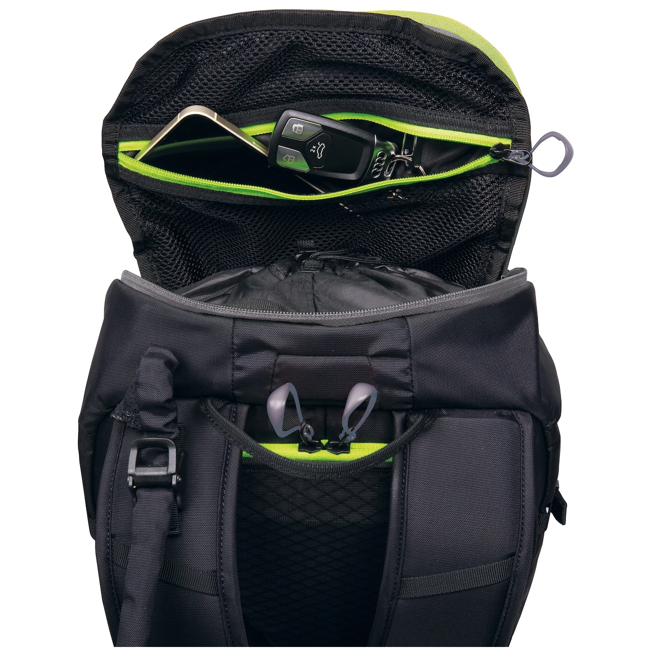 Do batohu se dostanete za pomocí velkého víka na zip s vnitřním stahováním a se širokým otvorem Full BackDoor. Uvnitř je kapsa na hydrovak a vnitřní síťovaná kapsa. Batoh má vyhrazenou přihrádku s rychlým přístupem. Elastická boční kapsa umožňuje například uložení mokrých věcí.