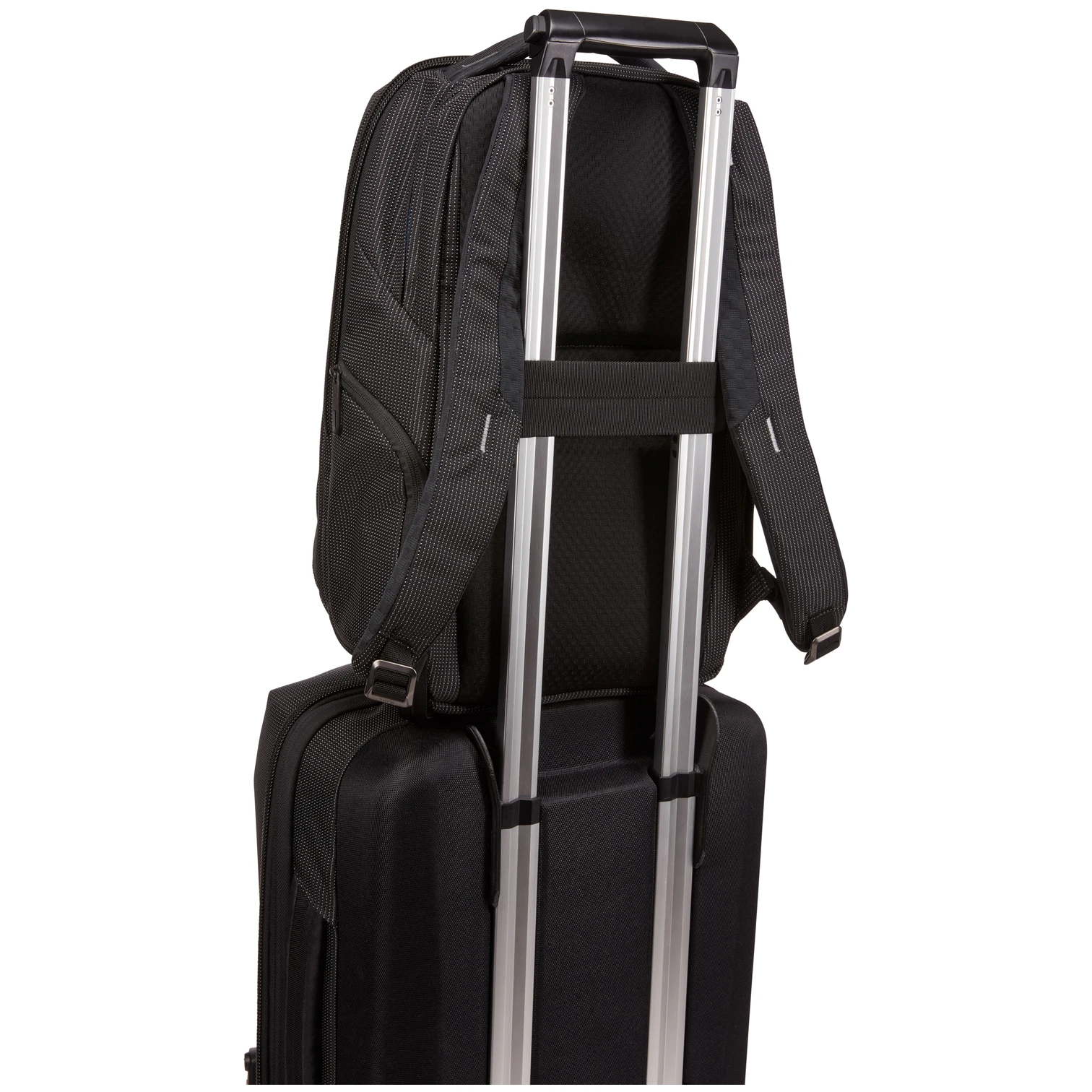 - bezpečné zavěšení batohu na zavazadlo na kolečkách pomocí integrovaného pásu s otvorem