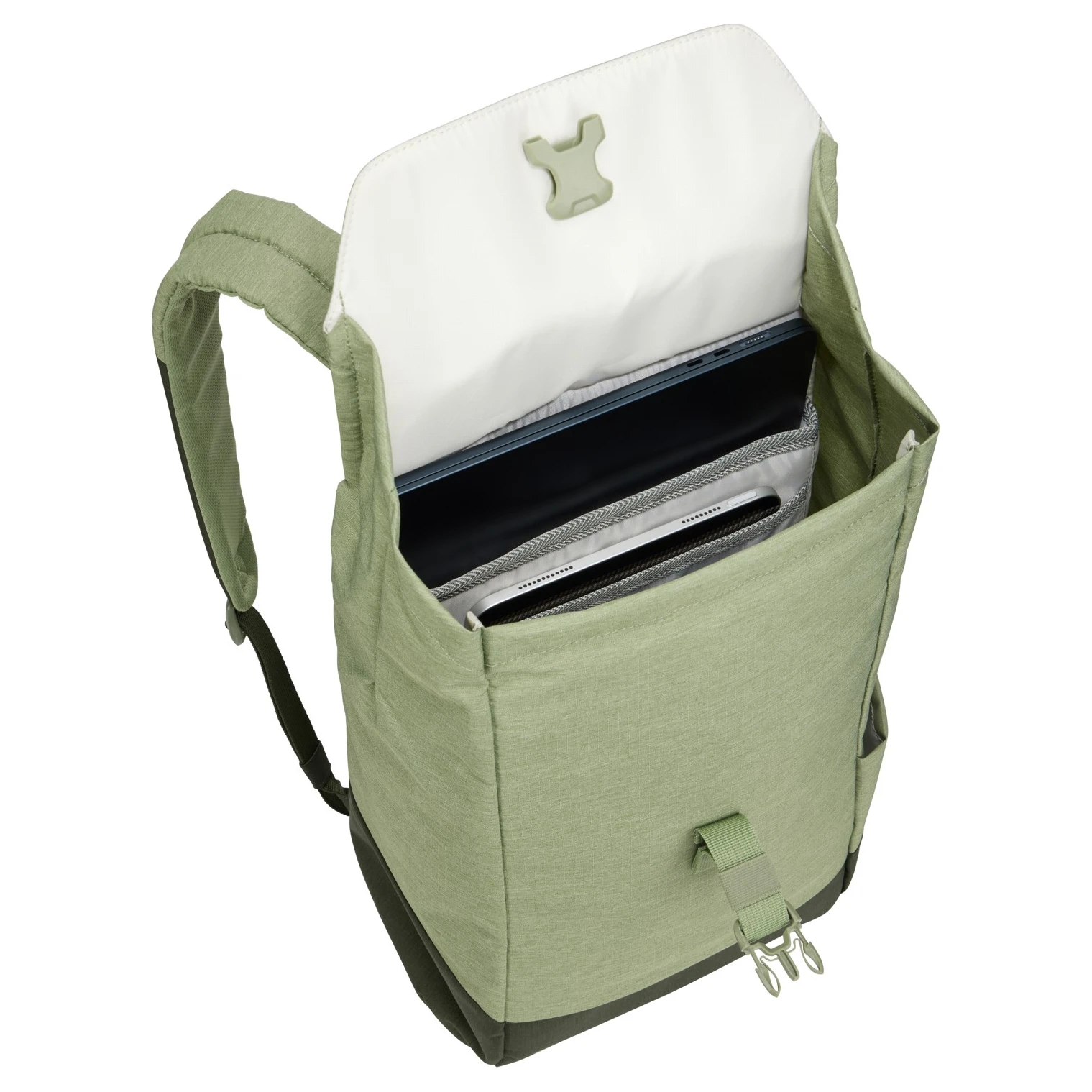 - věci v hlavním oddílu zajistíte pomocí nastavitelné klopy se skrytým zavíráním na přezku