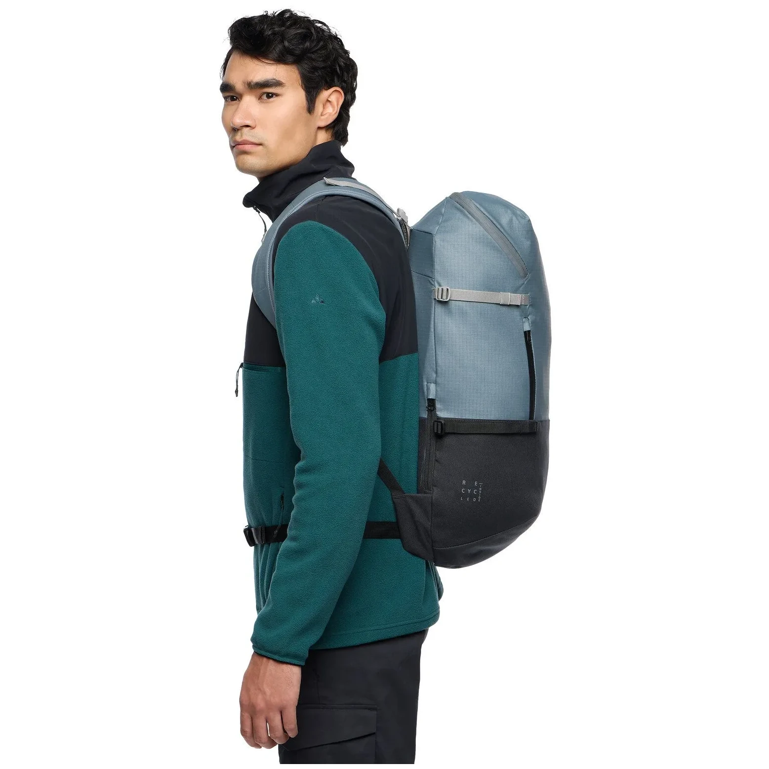 Ergonomické ramenní popruhy ErgoShape, bederní pás a ventilovaná záda Vent-Comfort zajišťují pohodlí i při plném zatížení. Materiál Eco Finish odpuzuje vodu a nečistoty bez PFC a je vyroben z recyklovaného PET a polyamidu, snižující ekologickou stopu.
