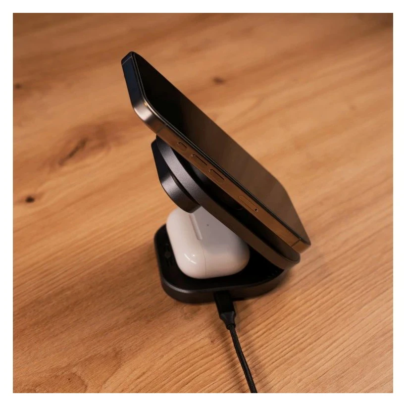 Skládací konstrukce umožňuje složit nabíječku do kompaktního tvaru, ideálního na cesty nebo pracovní stůl. Povrch v matné černé a tmavě šedé působí prémiově a dokonale ladí s moderní elektronikou Apple i Android.