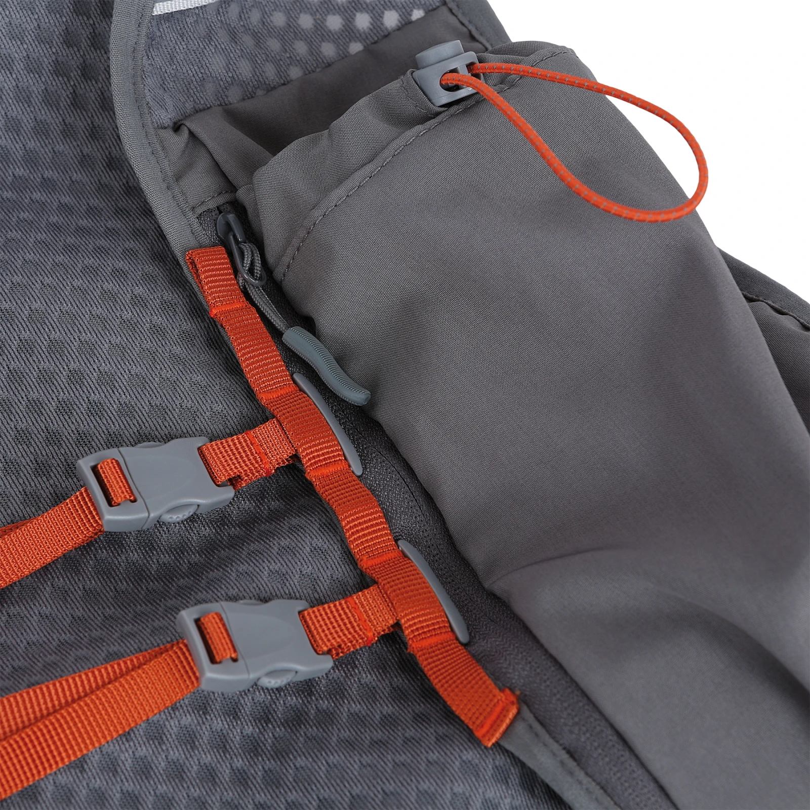 Na zadní straně se nachází dvě kapsy, z nichž jedna je na zip pro bezpečné uložení cenností. Nechybí ani prostor pro hydrovak, což umožňuje pohodlné doplňování tekutin během běhu. V přední části jsou umístěny dvě stahovatelné hrudní kapsy, ideální například na soft flasky nebo energetické tyčinky, takže vše důležité je snadno dostupné bez nutnosti zastavení.