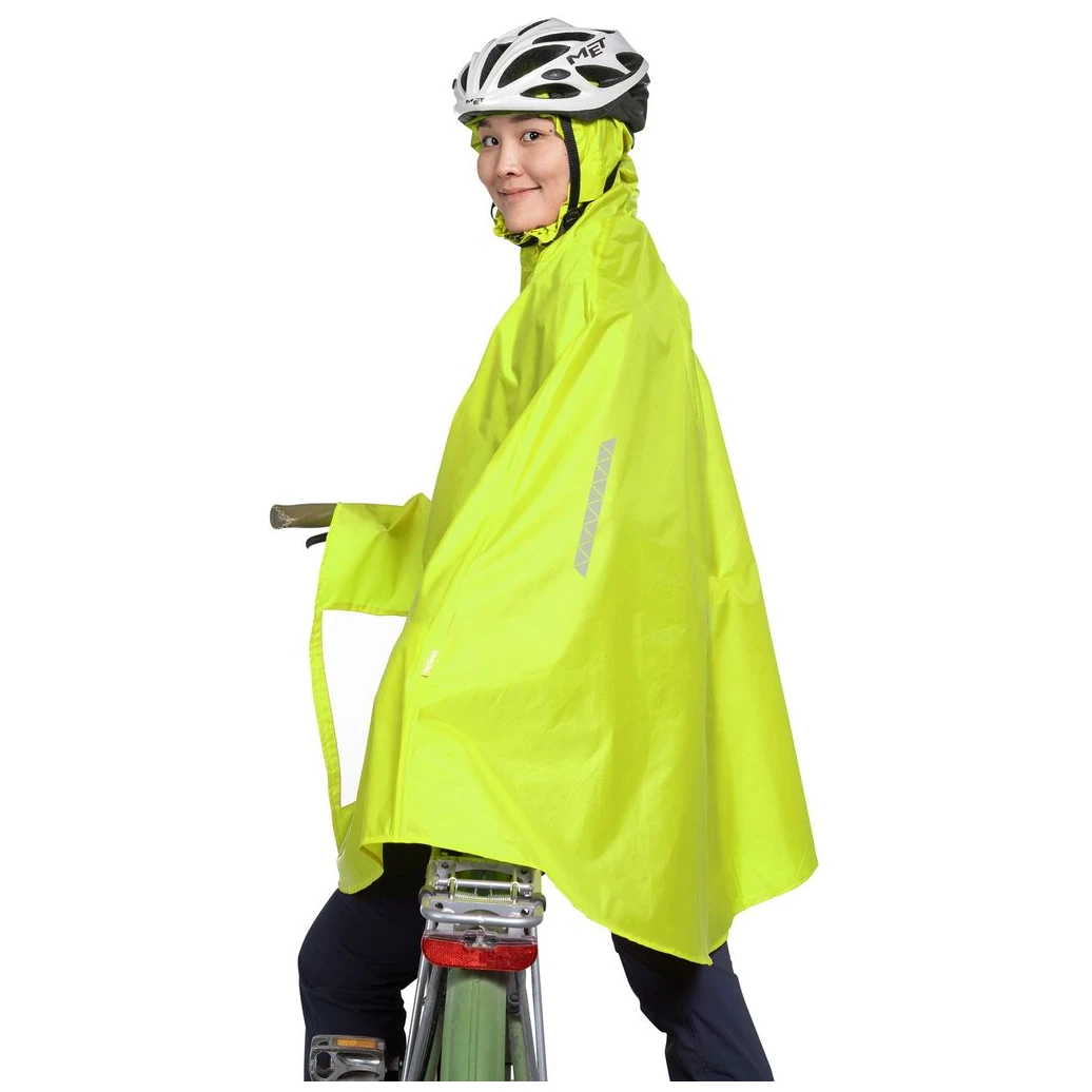 Pončo má kapuci se stahovací šňůrkou, kterou lze nosit pod nebo přes cyklistickou helmu. Díky elastickému pasu drží pevně i při jízdě proti větru a dvě poutka na palce zajišťují, že pončo zůstane na svém místě. Pro větší pohodlí jsou po stranách rozparky pro volný pohyb rukou.