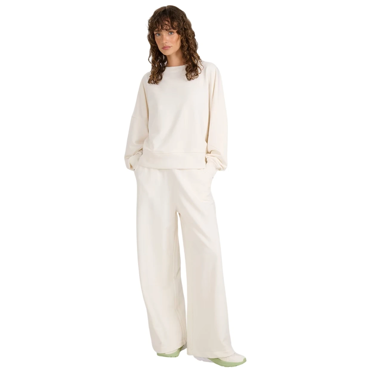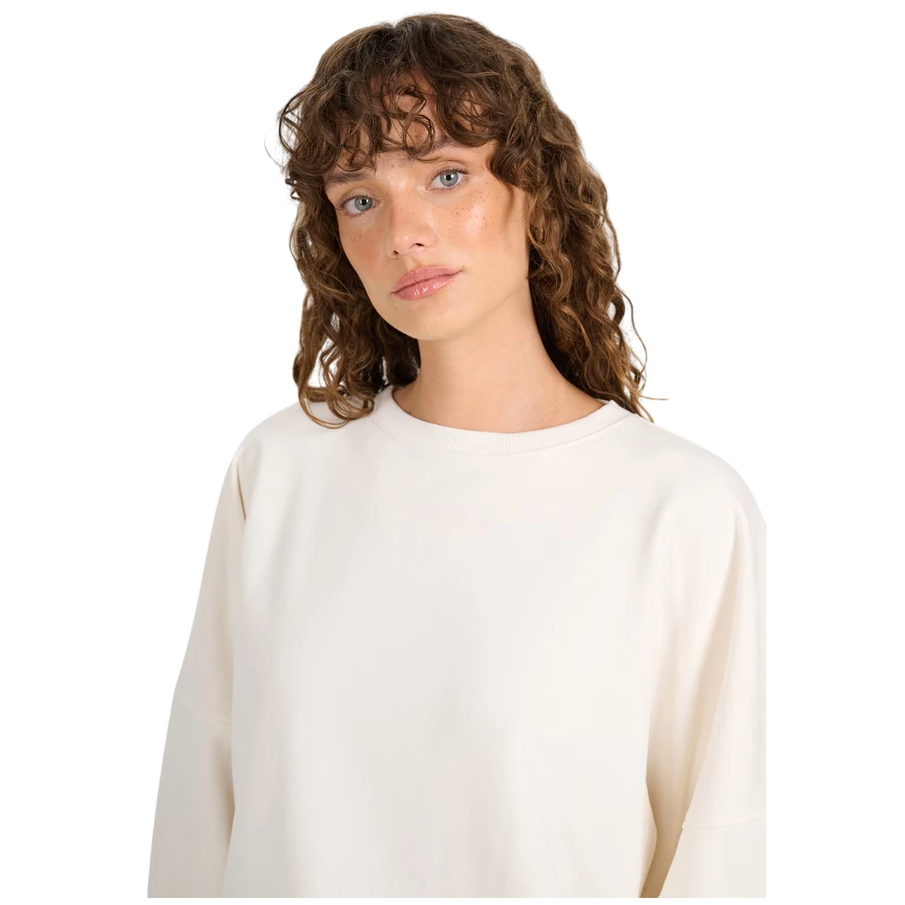 Pletenina typu french terry je hladká z vnější strany a uvnitř má smyčkovou strukturu, díky čemuž je mikina příjemná na dotek a více prodyšná. Model má kulatý výstřih s lemem, elastické manžety a spodní lem, což drží tvar i při častém nošení. Mikina se obléká přes hlavu a nemá kapsy, což podtrhuje její minimalistický vzhled.
