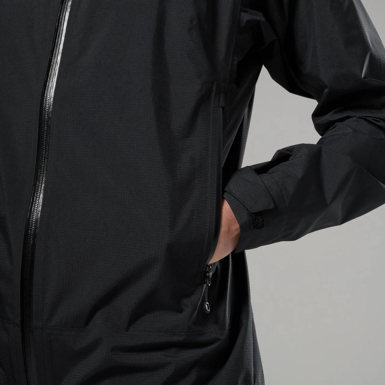 Základ tvoří materiál Pertex® Shield 2,5 L, který kombinuje recyklovanou 40D ripstop tkaninu s voděodolnou a větruodolnou membránou. Vnitřní 20D trikotová podšívka je příjemná na dotek a zvyšuje komfort při nošení. Konstrukce je navržená s důrazem na nízkou hmotnost a funkčnost, přičemž omezený počet švů pomáhá zvýšit odolnost a zároveň podporuje prodyšnost při aktivním pohybu.