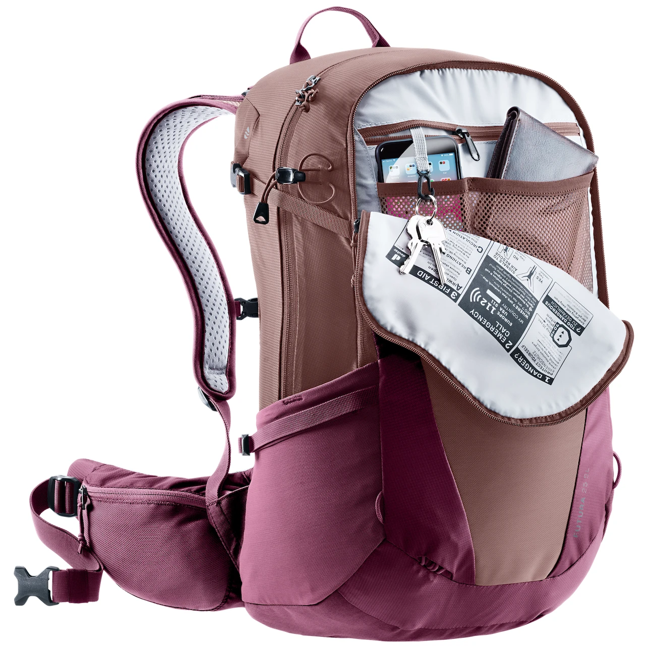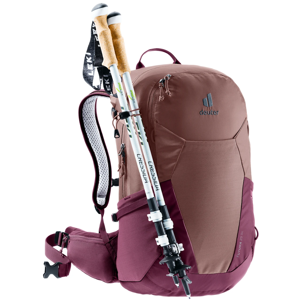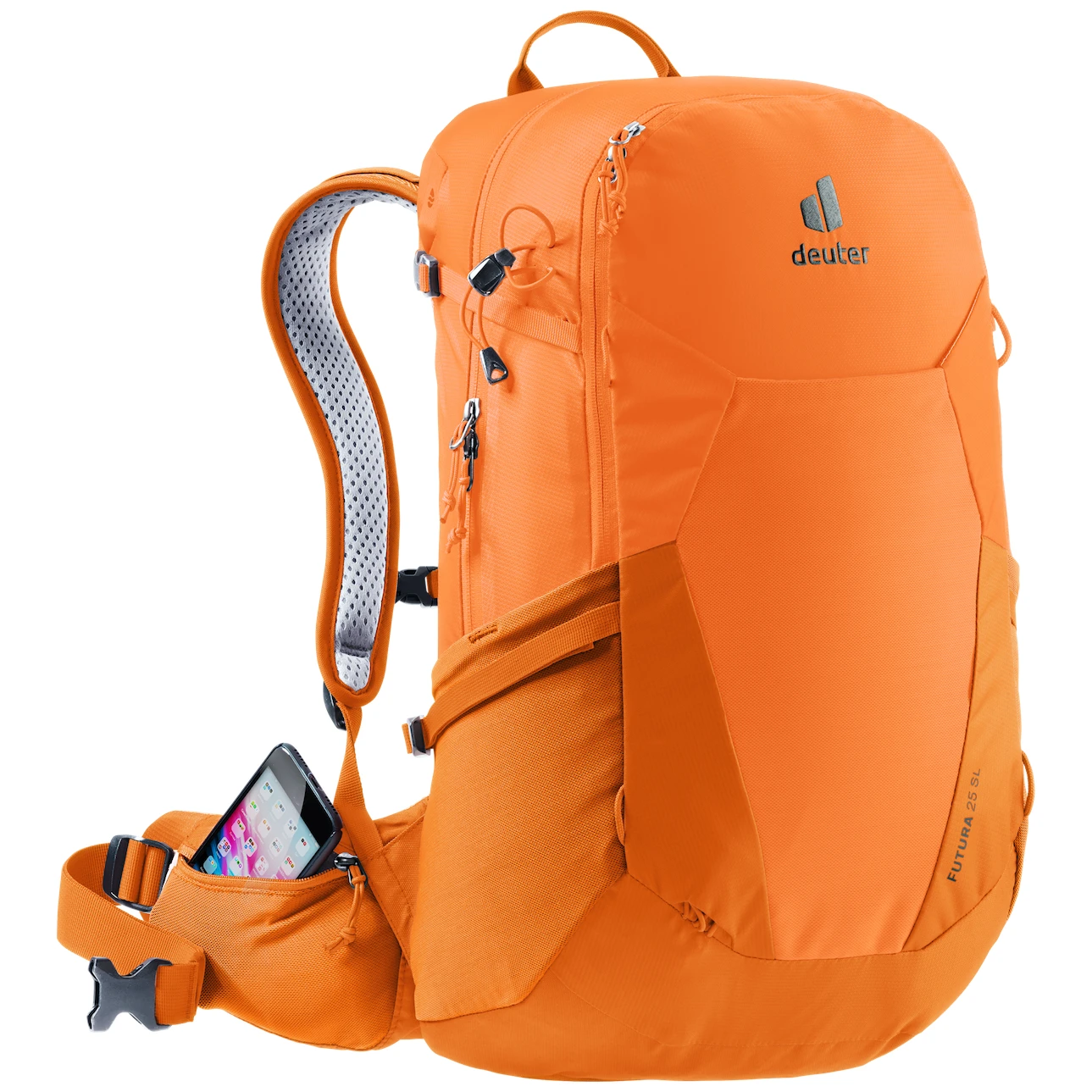 Turistický dámský batoh Batoh Futura 25 SL značky Deuter s objemem 25 litrů je speciálně navržen pro ženy jako ideální volba na hory či toulky po lese. Tento lehký technický batoh nabízí kovovou výztuhu, která se postará o rozložení váhy a díky užším polstrovaným ramenním popruhům poskytuje lehkost a pohodlí na cestách. Batoh má kratší záda a kónické bederní ploutve pro bezpečné uchycení kolem zad. Batoh je speciálně navržen pro ženy s novým zádovýmsystémem Aircomfort, který poskytuje maximální proudění vzduchu pro suchá záda.