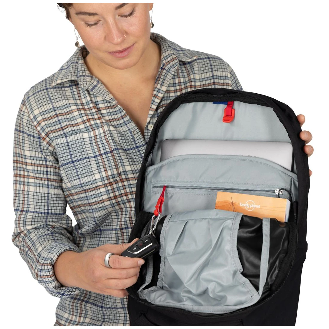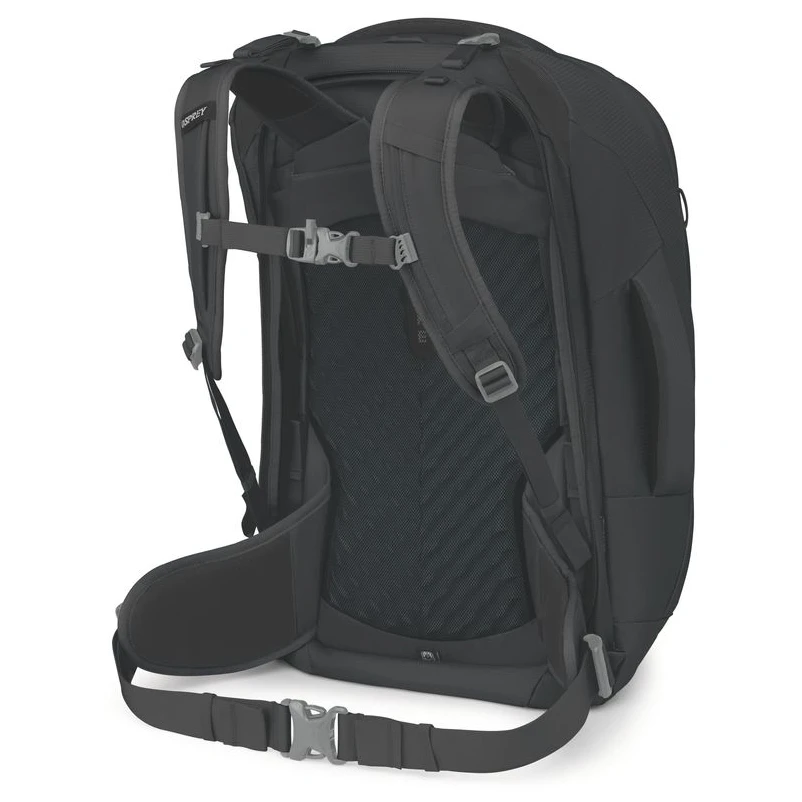 Velký přední vstup do hlavní komory usnadňuje balení, zatímco vnitřní i přední kompresní popruhy stabilizují obsah. Nechybí horní kapsa na drobnosti, dvě kapsy na zip na bederním pásu, multifunkční vnitřní přihrádka na hydrovak nebo notebook a pevná horní i boční madla. Součástí je integrovaný AirCover™, který chrání batoh při odbavení a zároveň slouží jako pláštěnka. Batoh je kompatibilní s přídavným Travel Daypackem nebo Daylite™ a splňuje standard bluesign® PRODUCT.