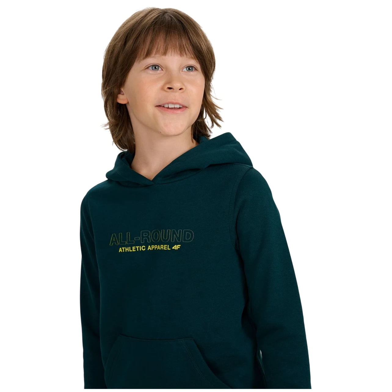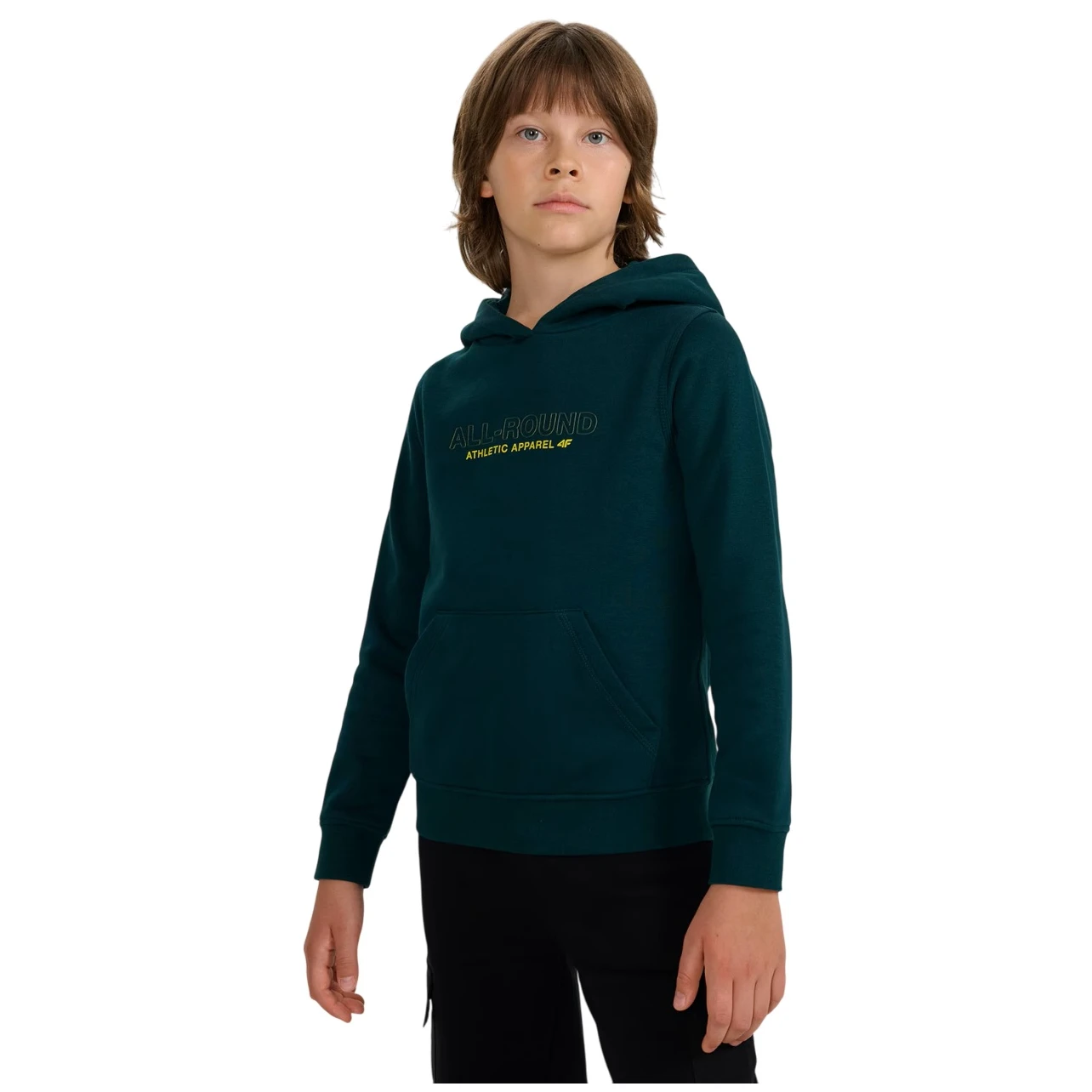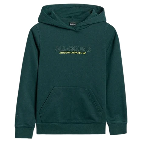 Dětská mikina Sweatshirt M1959 4F s česanou vnitřní stranou, kapucí a klokaní kapsou poskytuje teplo, pohodlí a volnost pohybu při každodenním nošení.