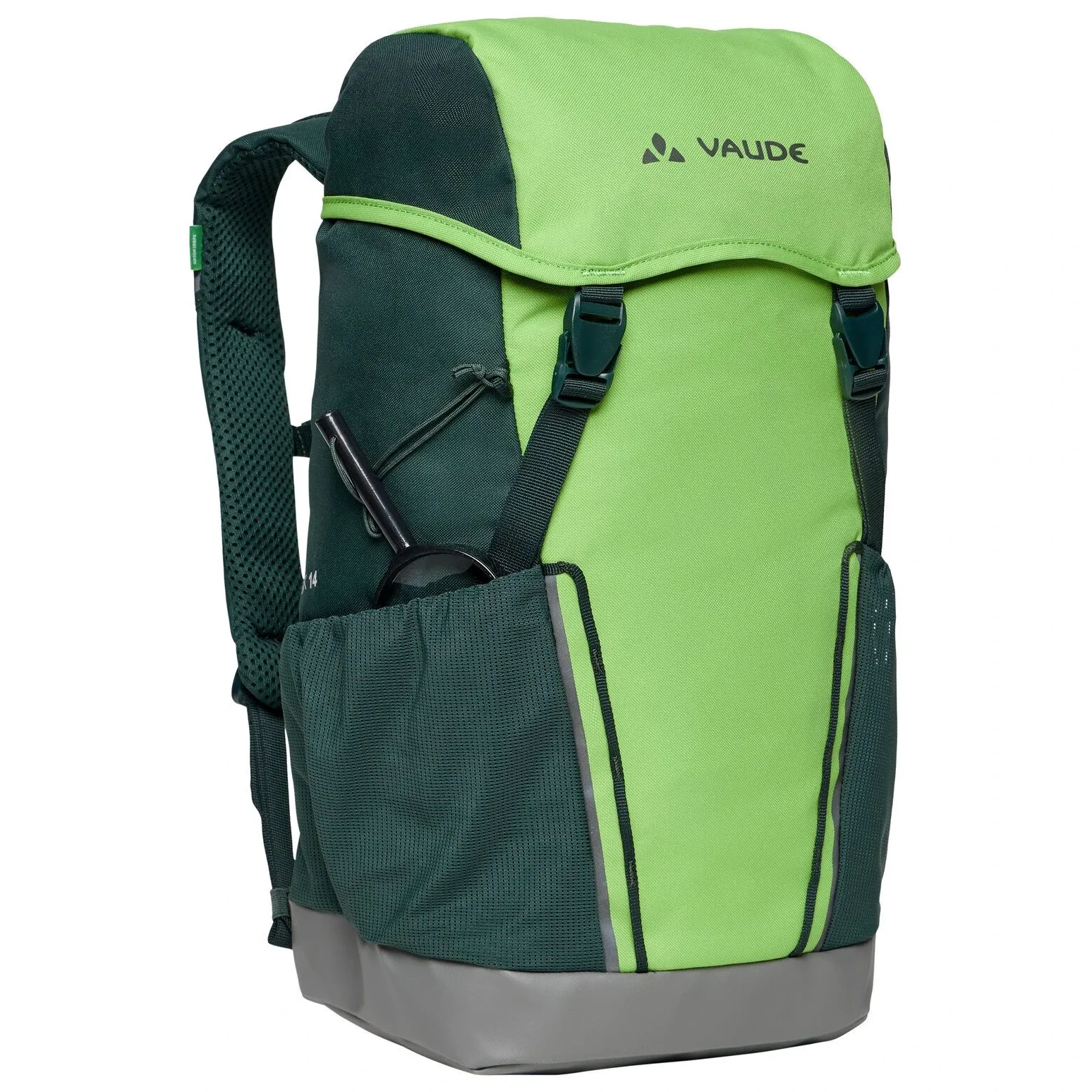Pohodlný dětský batoh Puck 14 značky Vaude je v této verzi ještě lépe přizpůsobený potřebám dětí. Má voděodolnou podlážku, takže se nemusíte obávat, když děti batoh postaví do mokra. Systém odpružení a nastavitelný hrudní popruh zajišťují to nejpohodlnější nošení. Součástí batohu je i pláštěnka a polstrovaná podložka na sezení. Batoh má dvě prostorné síťované vnější kapsy, reflexní potisk a kapsu ve víku na drobnosti. Malé objevitele potěší, že batoh Puck 14 má zabudovanou lupu. Tento batoh je vyroben z recyklovaného materiálu a je vyroben s Eco Finish, ekologickým vodoodpudivým materiálem bez použití fluorokarbonů (PFC).