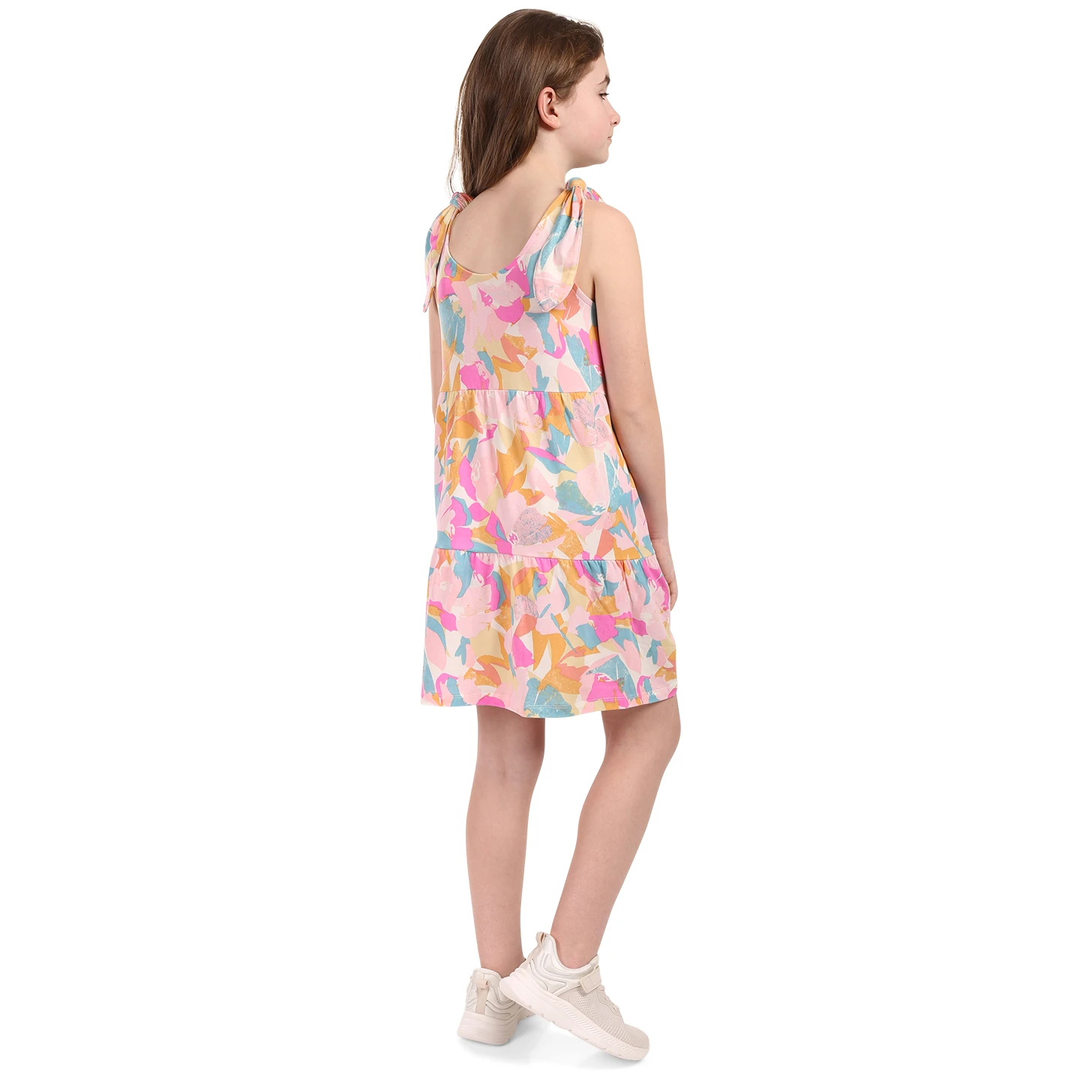 Dětské letní šaty Areno jsou skvělou volbou pro každou malou slečnu, která chce v teplých měsících vypadat stylově a zároveň se cítit v naprostém pohodlí. Jsou ušité z lehkého, pružného a výborně prodyšného materiálu (95 % polyester, 5 % elastan), díky čemuž poskytují skvělý komfort během celodenního nošení. Šaty mají slušivý polopřiléhavý střih do tvaru A a délku nad kolena, což společně s horním dílem na ramínka zaručuje maximální vzdušnost v parných letních dnech. Oblíbený celoplošný potisk zaujme na první pohled a hravý charakter dotváří také originální nášivka na předním dílu. Tento model je naprosto perfektní pro každodenní nošení, rodinné výlety do přírody, cesty do města i pohodovou letní dovolenou u vody.