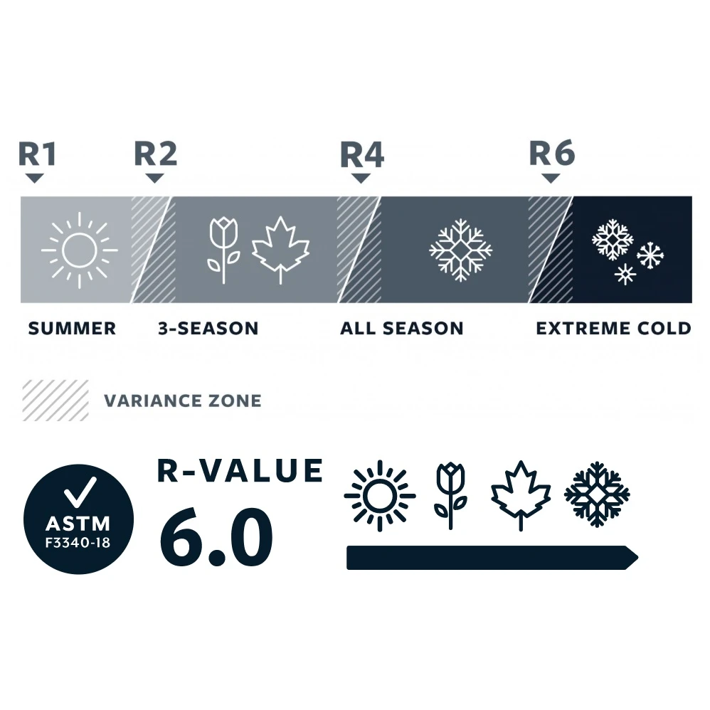 Hodnota R-value ukazuje tepelný odpor karimatky. Čím vyšší číslo, tím lepší izolace chladu od země. Karimatky s hodnotou R1 jsou vhodné pro letní využití, univerzální (třísezónní) jsou karimatky s hodnotou R2-3. Pro zimní využití vybírejte z karimatek s hodnotou R3,5 a výše. R5 a víc jsou vhodné do extrémních podmínek a spaní na sněhu.