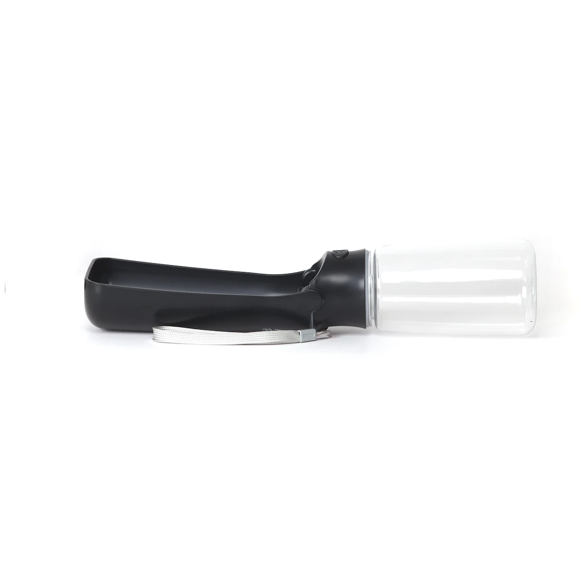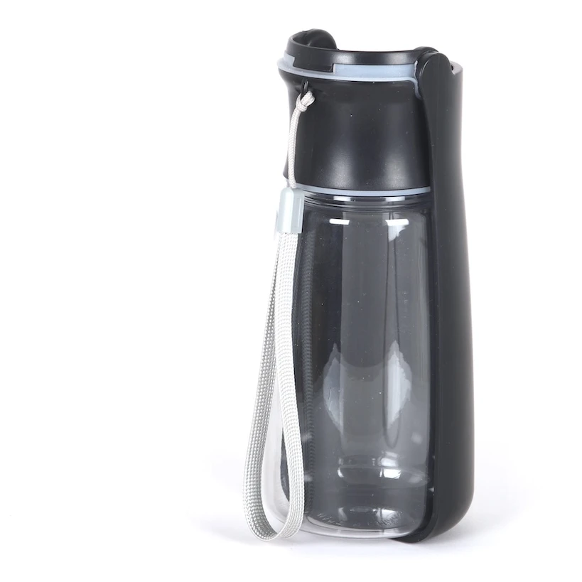 Láhev je vyrobená z pevného plastu a po rozložení víko tvoří misku na pití. Dávkování vody aktivujete tlačítkem. Poutko umožňuje zavěšení na zápěstí i na batoh. Láhev se snadno udržuje v čistotě.