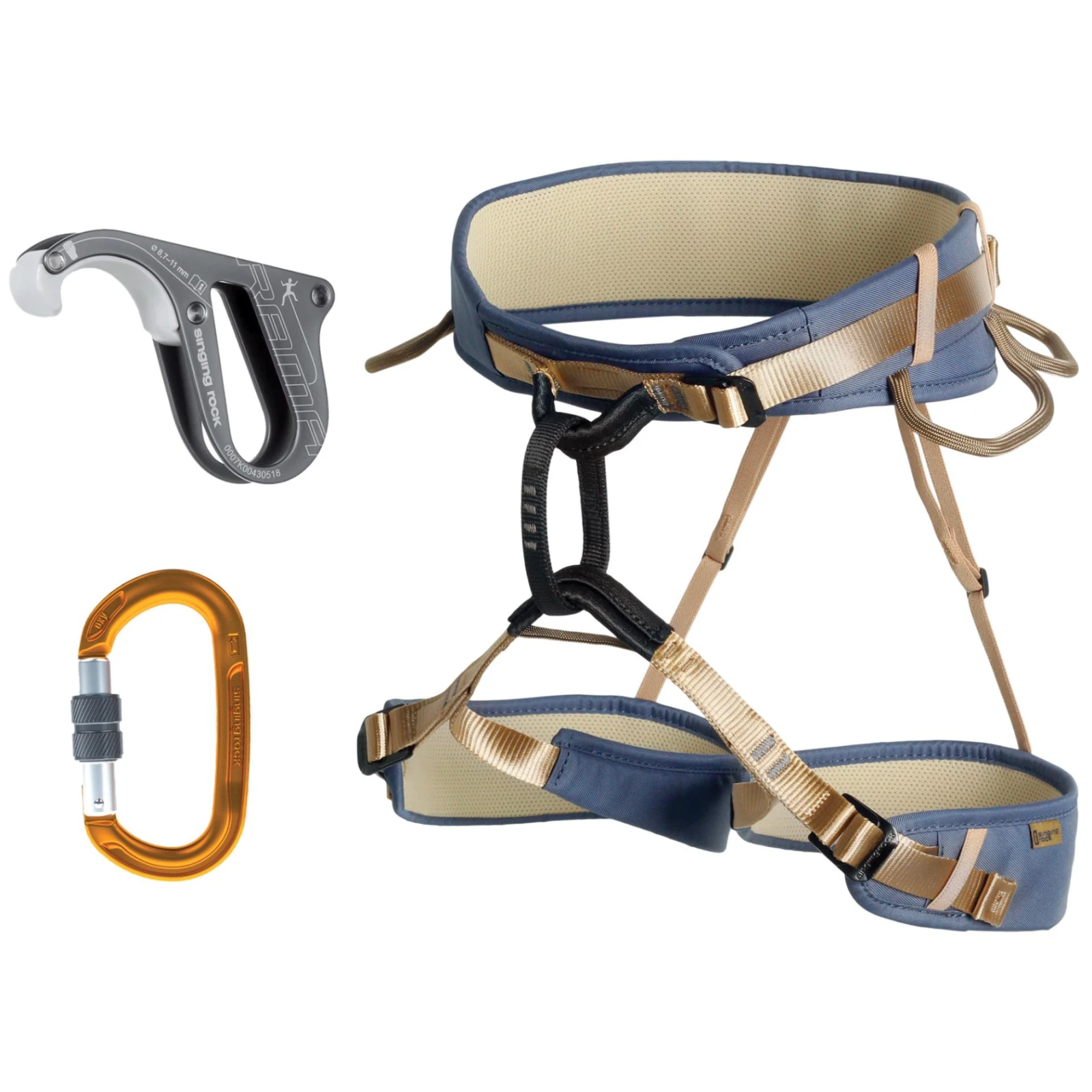 Lezecký set od Singing Rock pro začínající lezce obsahuje sedák Ray, karabinu Oxy a intuitivní jistítko Rama.