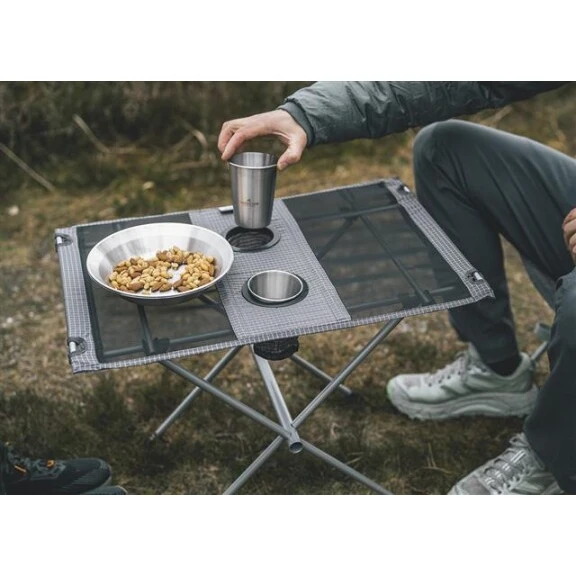 Konstrukce z odolné oceli zajišťuje spolehlivou stabilitu a nosnost až 20 kg. Deska stolu je z 300D nylonu s dvojitým ripstopem a nylonové síťoviny.