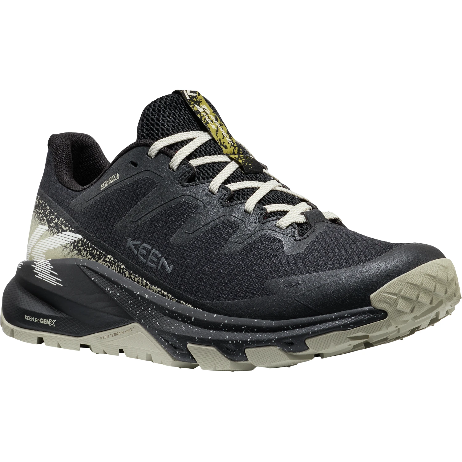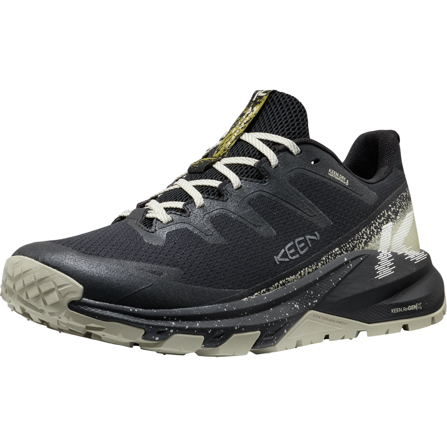 O pohodlný došlap se stará lehčí mezipodešev KEEN.ReGEN+, která je odolnější proti stlačení a vrací více než 60 % energie. Celodenní komfort podporuje vyjímatelná pěnová stélka, tvarovaná klenba i střih Original Fit s dostatkem prostoru ve špičce. Jistotu v terénu zvyšuje podešev KEEN.ALL-TERRAIN s vícesměrným vzorkem, stabilizační klenek S3 a hmotnost 340 g přispívá k příjemně lehkému pocitu při chůzi.