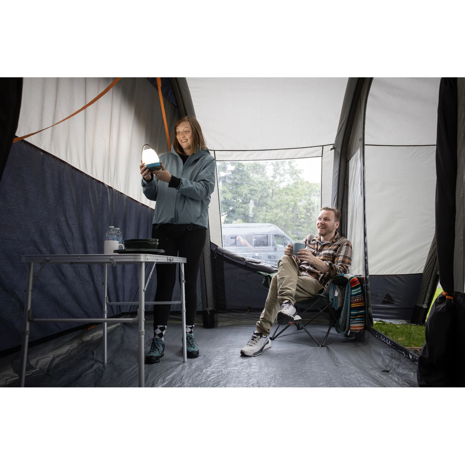 Tkanina Sentinel Active 150D s technologií ColourLok Eco je lehká, odolná a voděodolná s vodním sloupcem 4 000 mm, přičemž pomáhá udržet stálobarevnost i při dlouhodobém vystavení slunci. Předem připevněná přední stříška vytváří krytý prostor ideální pro posezení venku, zatímco Diamond Clear okna zajišťují dostatek světla a pocit vzdušnosti. Síťované dveře umožňují větrání bez hmyzu a větrací panely pomáhají snižovat kondenzaci uvnitř markýzy.