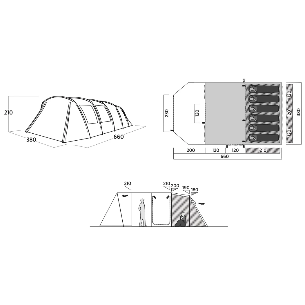 Stan má předsíňku s pevnou podlážkou a velkými okny, která nabízí prostor pro uložení věcí i pro běžný provoz. Okno lze zatáhnout, pokud potřebujete více soukromí. Dodatečné boční dveře s moskytiérou umožňují větší proudění vzduchu i flexibilní přistup dovnitř stanu. Před stanem je uzavíratelná stříška bez podlážky, díky které můžete sedět venku i když třeba mrholí, a která nabízí úložný prostor navíc. Dostatečná výška obývací části umožňuje vzpřímený pohyb. Uvnitř najdete zatemněnou ložnici SleepTight, které zajistí ničím nerušený spánek i přes den. Ložnici lze rozdělit za pomocí přepážky na dvě až tři části podle potřeby.