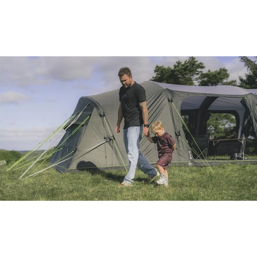 Stan se dále může chlubit propracovaným ventilačním systémem, úložnými kapsami, krytými vstupy pro prodlužovací síťové kabely umožňující zapojit lampičku nebo nabít mobil. Jistě také oceníte závěsný systém Hooktrack System, který umožňuje připevnit lehké drobnosti, kabely a lampičky na předem připravené "kolejničky". Integrovaný systém osvětlení Outwell Light poskytne útulné osvětlení uvnitř stanu napájené z libovolného zdroje USB-C. Na vnější stěnu ložnice doporučujeme přikoupit organizér Universal Tent Organizer, díky němuž budete mít všechny důležité věci hned po ruce. V balení se nachází nafukovací pumpa a přepravní obal s popruhy, který usnadňuje přenášení stanu.