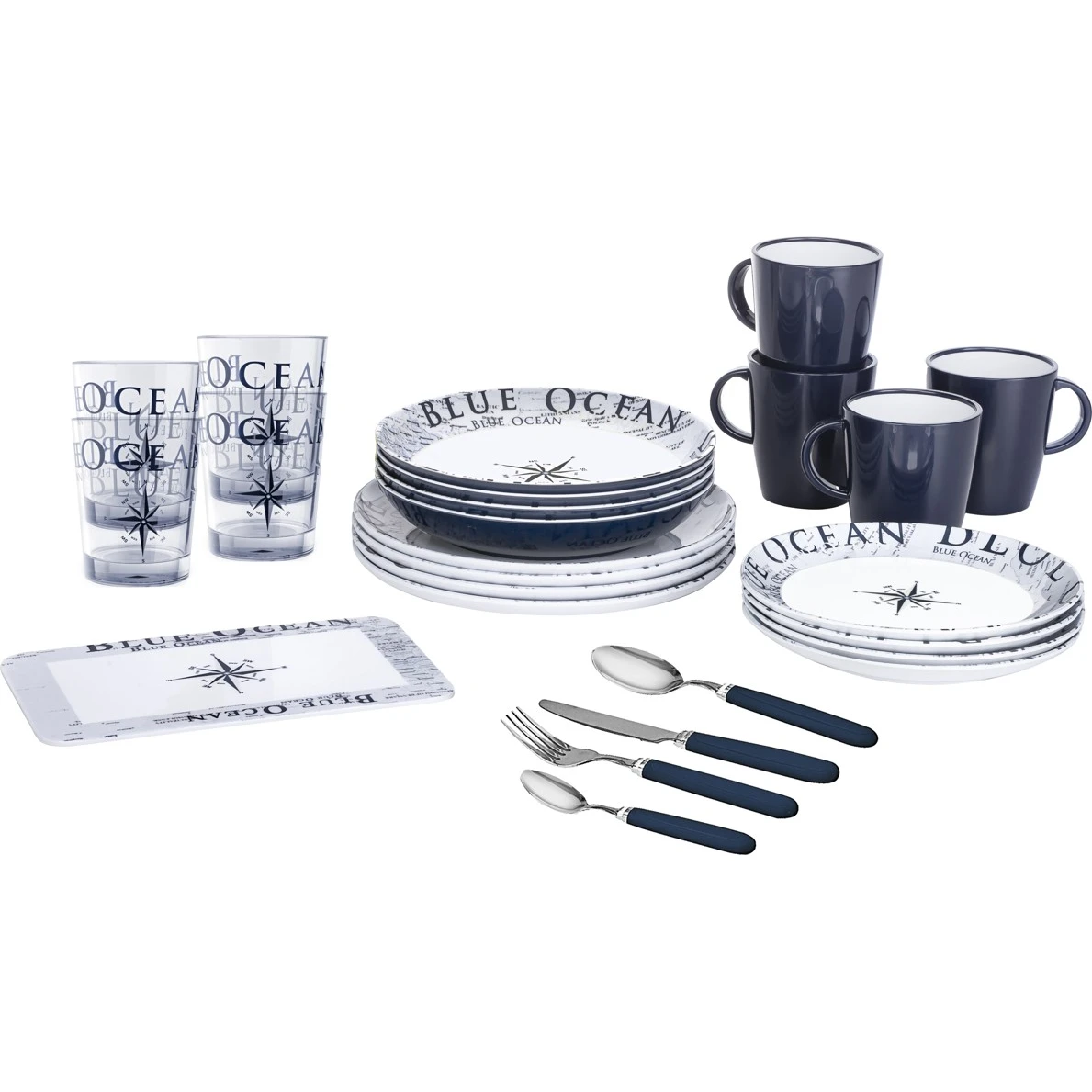 Sada All Inclusive Blue Oceanod značky Brunner obsahuje kompletní výbavu do kempu. Sada se skládá z 36 kusů nádobí a příborů, a je vhodná pro 4 osoby. V kempu jistě oceníte zvýšenou odolnost díky Melaminu. Tento materiál je odolný vůči nárazům, snadno se čistí, odolný vůči teplu a vlhkosti, bez zápachu a chuti a je šetrný k životnímu prostředí. Nádobí lze vložit do mrazničky i do myčky.