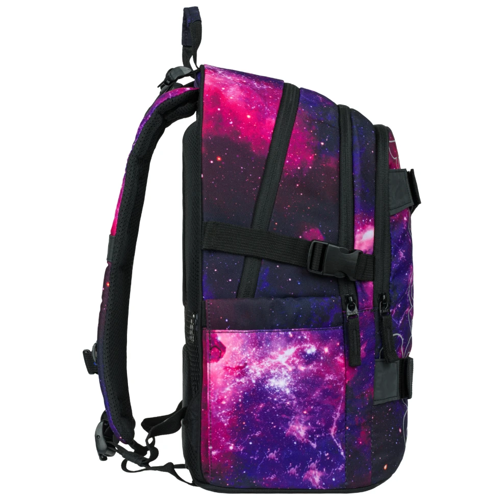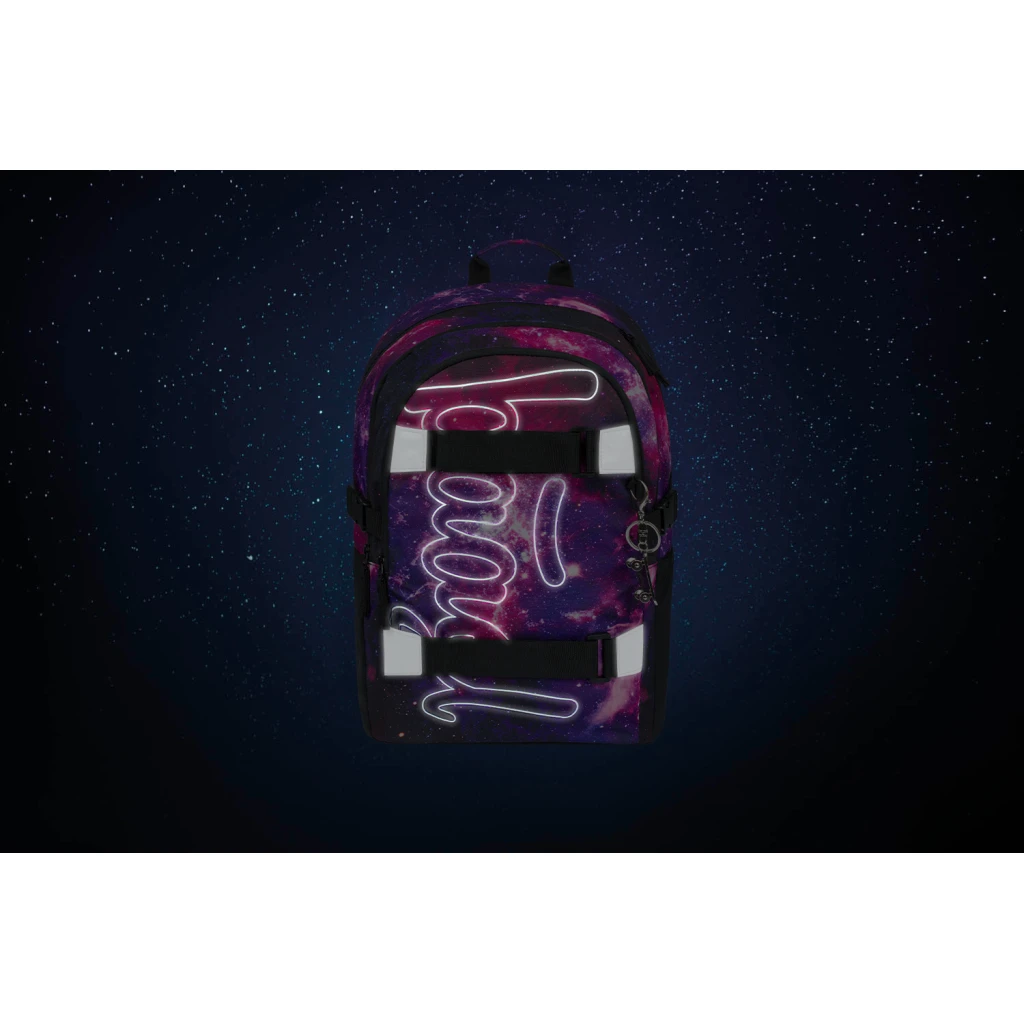 Batoh je vyroben z pevného a voděodolného materiálu. Má tři samostatné komory na zip. Uvnitř je praktický organizér a kapsa na 15" notebook či tablet. Dvě boční síťované kapsy jsou ideální pro láhev s pitím. Z přední strany jsou popruhy pro uchycení skateboardu. Reflexní prvky umístěné ze všech stran zvyšují viditelnost dítěte za špatných světelných podmínek.