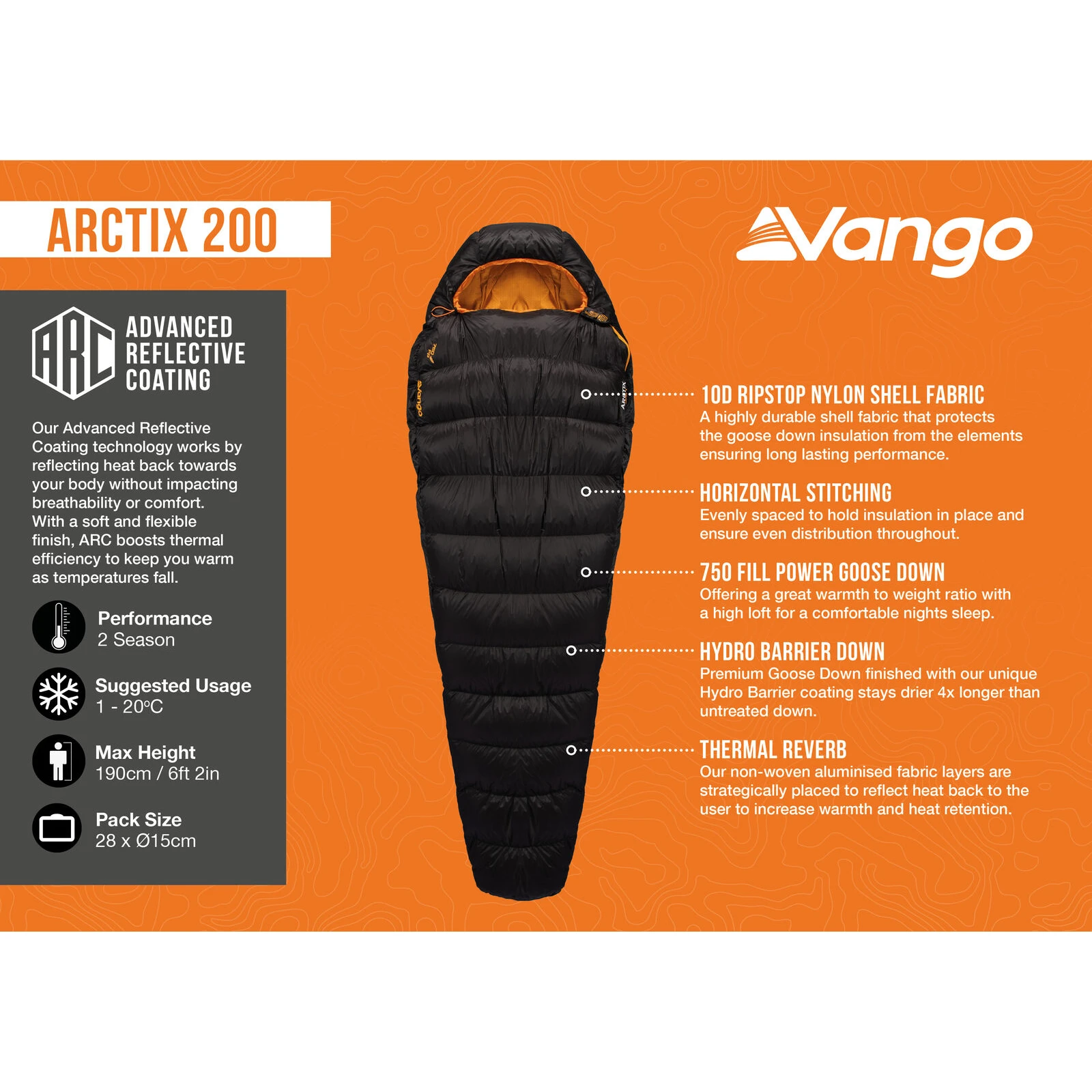 Spací pytel Arctix 200 značky Vango představuje špičku v kategorii lehkých péřových spacáků. Je navržen pro dobrodruhy, kteří vyžadují maximální tepelný výkon bez zbytečné zátěže. Výplň tvoří eticky získané husí peří s plnivostí 750, které poskytuje vynikající poměr tepla a hmotnosti a vysokou nadýchanost pro pohodlný spánek. Peří je ošetřeno technologií Hydro Barrier Down, díky níž zůstává až čtyřikrát déle suché než běžné peří a zachovává si izolační schopnosti i ve vlhkém prostředí.