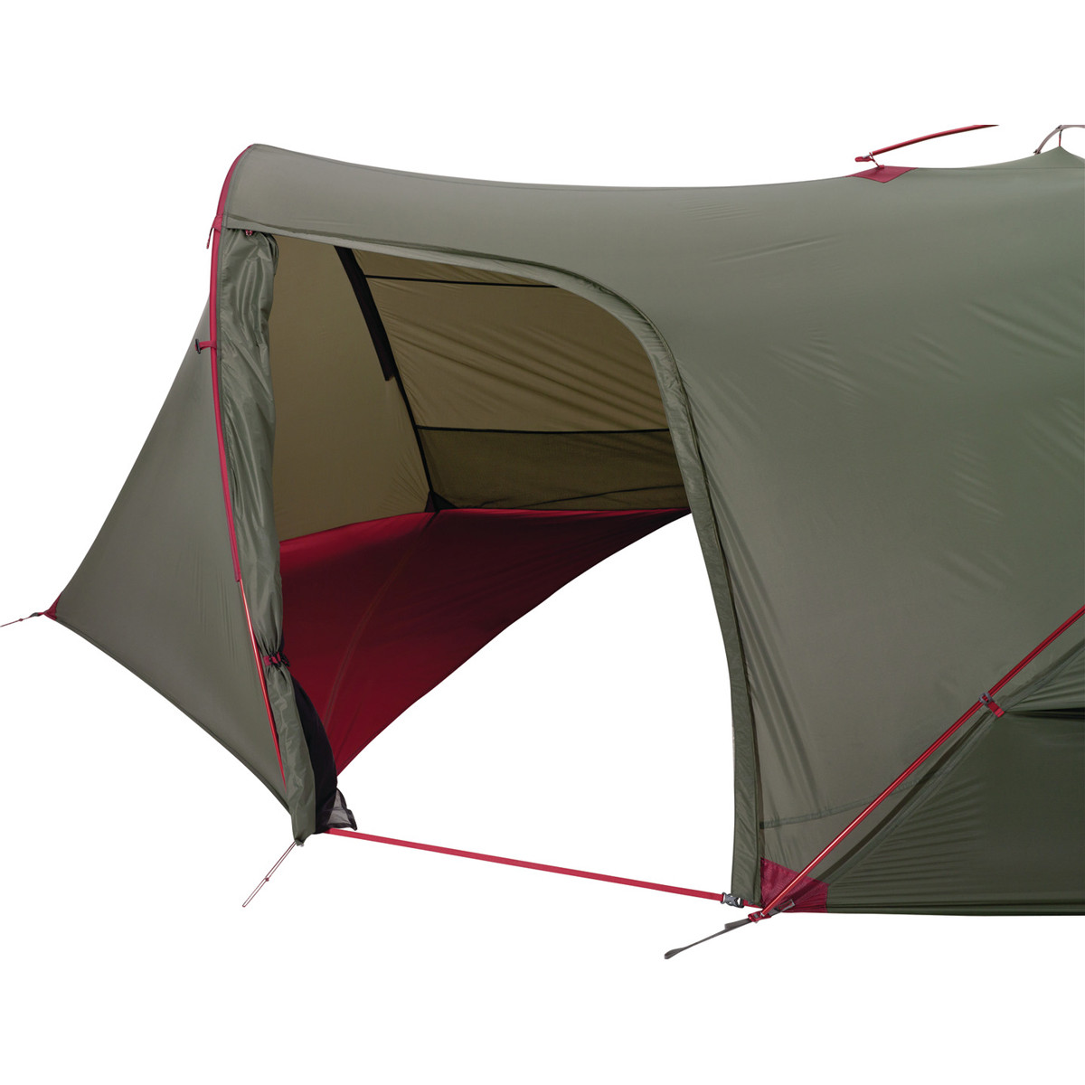 Velký vchod ve tvaru D usnadňuje vstup do předsíně. Tato verze má navíc velké zadní dveře pro přímý vstup do ložnice. Nastavitelná poutka na kolíky usnadňují upnutí stanu. Stan sbalíte do přiloženého kompresního obalu.