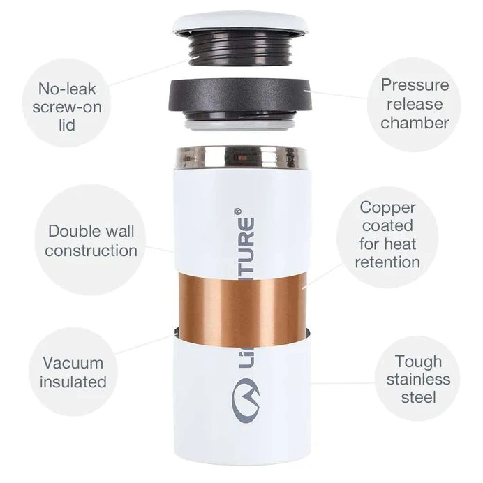 Dvouplášťová konstrukce je vylepšena měděnou vrstvou, která zajišťuje ještě lepší izolační vlastnosti. Váš nápoj tak zůstane déle horký, nebo naopak studený. Víčko lze pro dokonalé a hygienické čištění kompletně rozebrat.