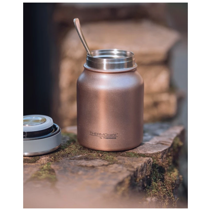 Thermos Thermocafé je nerezová vakuově izolovaná termoska na jídlo o objemu 500 ml, navržená pro pohodlné přenášení a uchování teplých i studených pokrmů. Skvěle se hodí na polévky, hotová jídla, kaše nebo naopak studené pokrmy, jako jsou saláty či ovoce, ať už do práce, školy nebo na cesty.