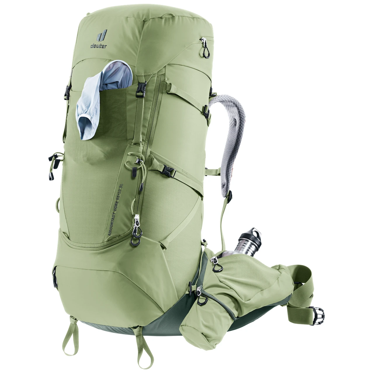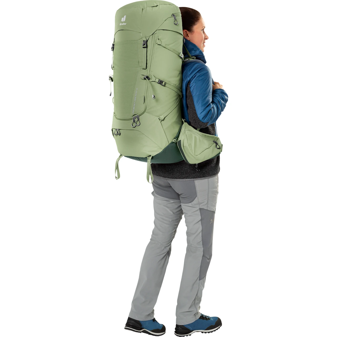 Rám ve tvaru Y v kombinaci s pohyblivými bederními popruhy, které se obepínají kolem boků, a ergonomickou bederní podložkou Deuter ve tvaru lichoběžníku se spojují tak, aby efektivně rozložily a stabilizovaly zátěž. Díky zipu po celé délce ve tvaru písmene J na přední straně lze obsah snadno najít níže v hlavní komoře. Velké, odnímatelné kapsy na bederním pásu (3 l) poskytují další úložný prostor a udržují předměty na dosah. Odnímatelné pouzdro na láhev o objemu 1,5 litru Vám také umožní hydratovat na cestách. Kratší nosní systém batohu (SL) je vhodný pro osoby s menší výškou.