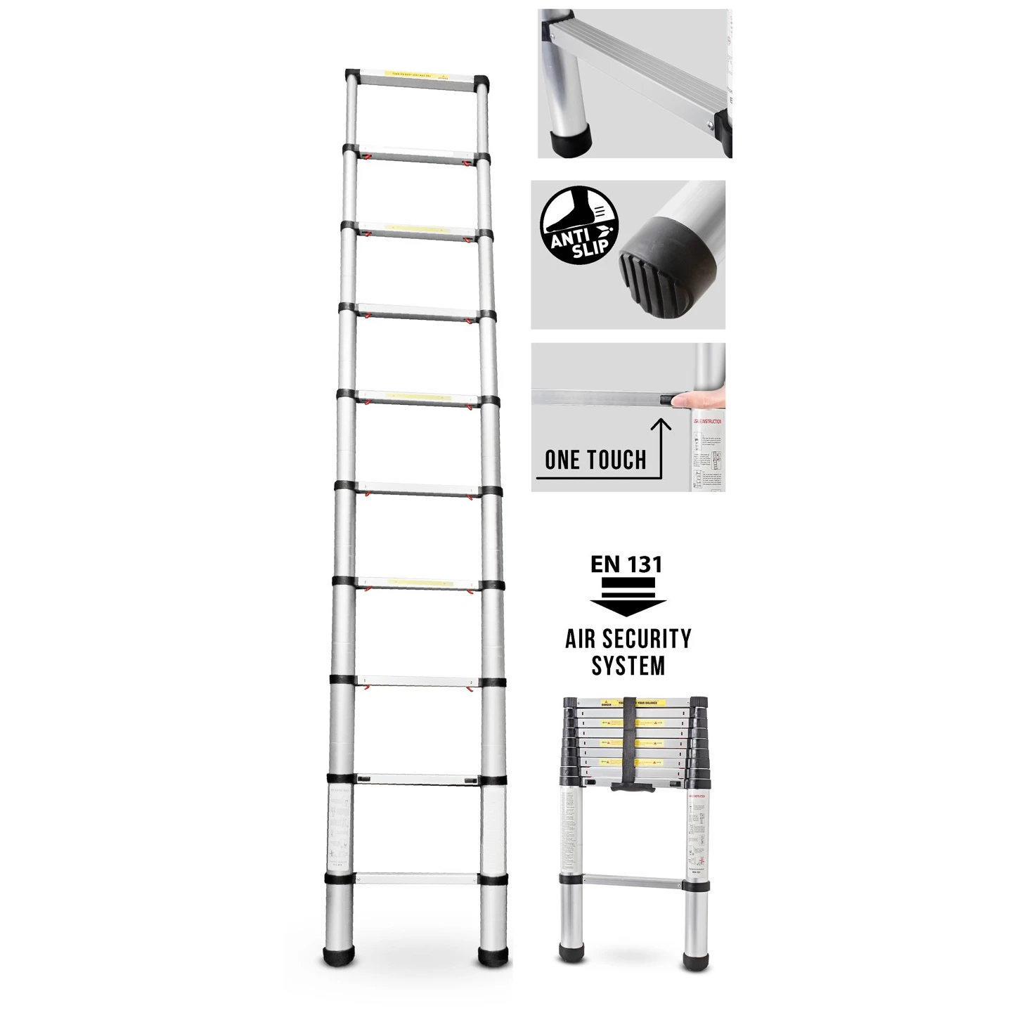 Teleskopický hliníkový žebřík Laddy Air od značky Brunner s nově vyvinutou technologií vzduchového tlumení, která eliminuje riziko poranění prstů. Snadno se přenáší a je výškově nastavitelný. Vybaven protiskluzovými gumovými podložkami pro zvýšenou bezpečnost. Kompaktní skladování.