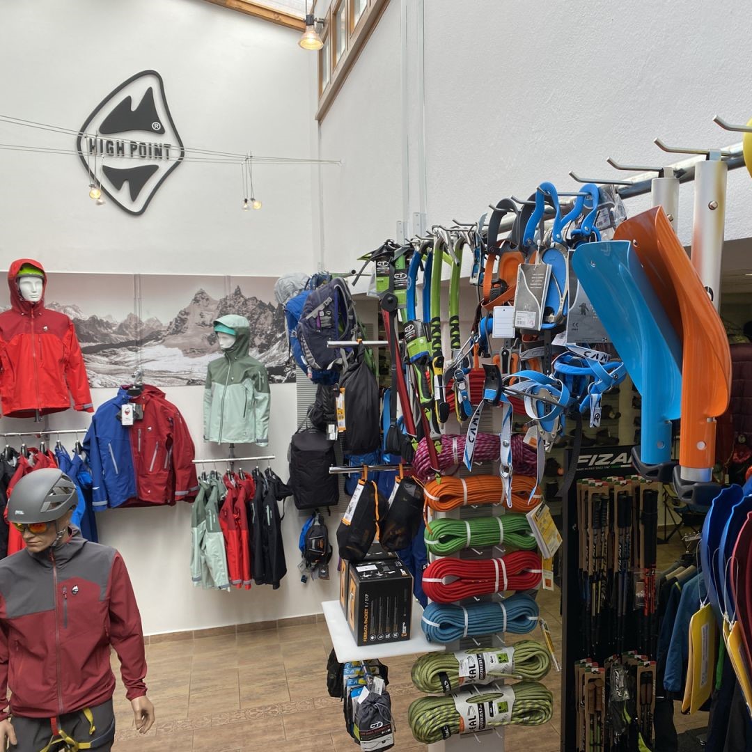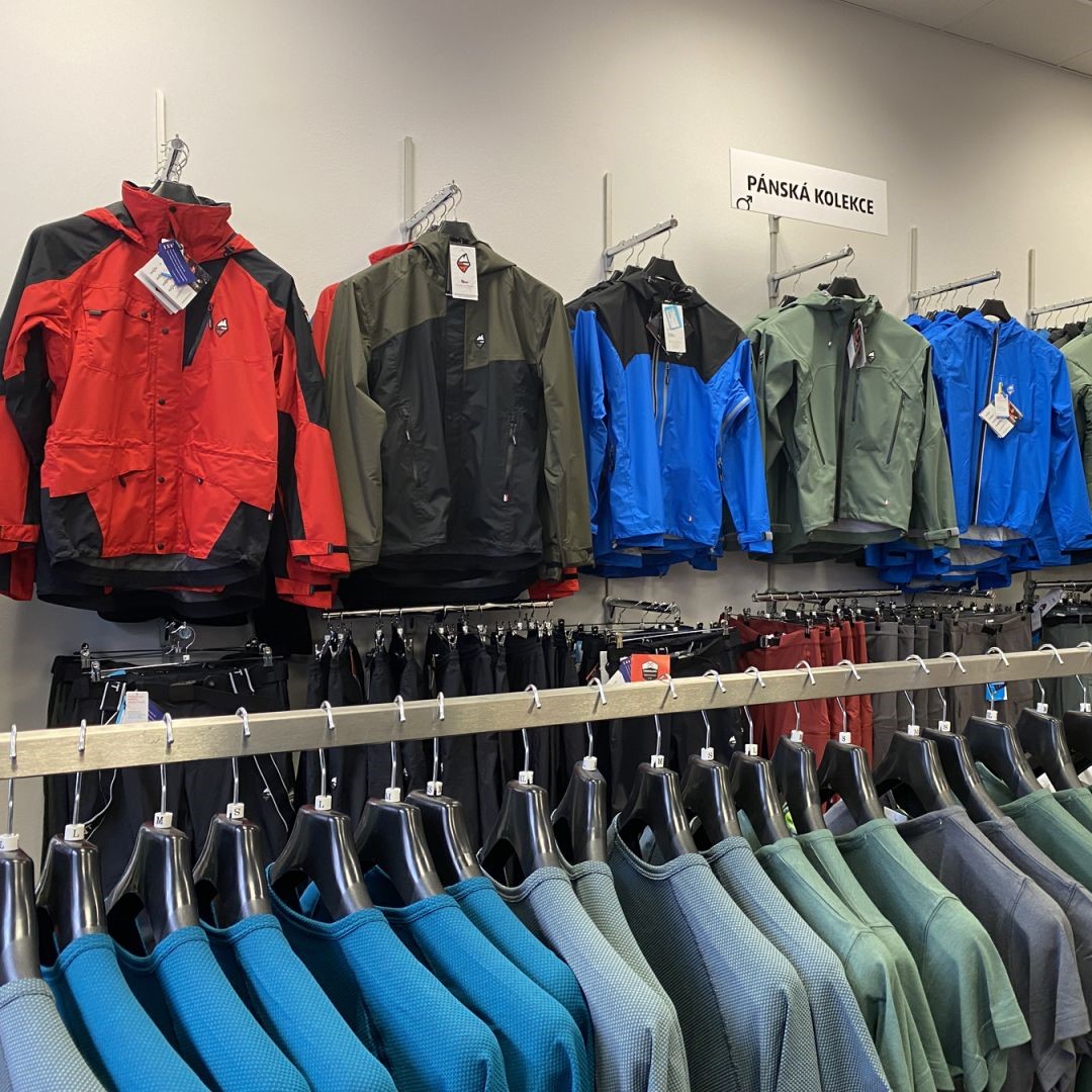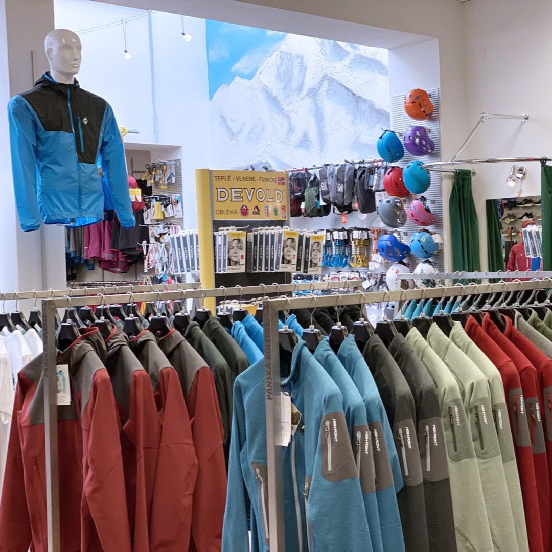 Na výdejně můžete zakoupit vybrané oblečení od značky High Point. Najdete zde také obuv a vybavení na lezení od 4camping. Na pobočce se však nachází pouze malý výřez našeho širokého sortimentu, doporučujeme tedy vše nezávazně objednat, než k nám vyrazíte.