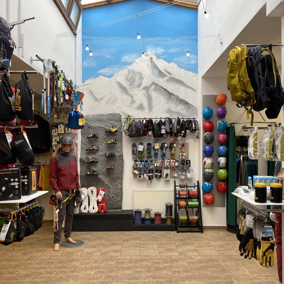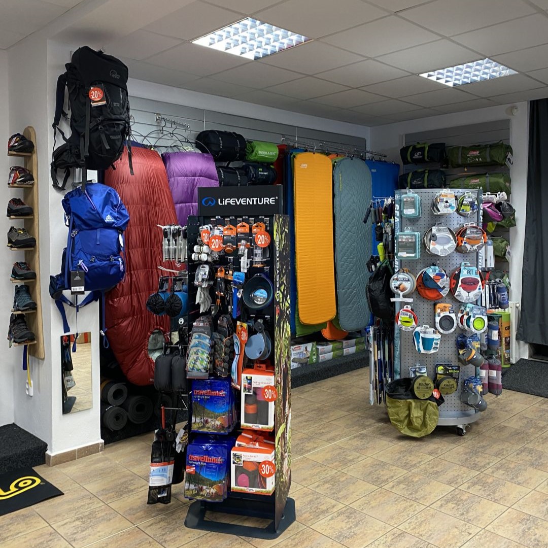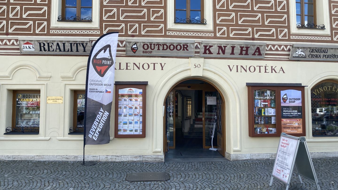Na výdejně můžete zakoupit vybrané oblečení od značky High Point. Najdete zde také obuv a vybavení na lezení od 4camping. Na pobočce se však nachází pouze malý výřez našeho širokého sortimentu, doporučujeme tedy vše nezávazně objednat, než k nám vyrazíte.